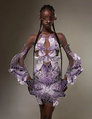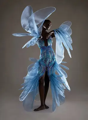 Aeroplane / Remote Control Dress est une robe moulée en composite (fibres de verre + résine) dont la jupe comporte des volets articulés évoquant les flaps d’un avion. Présentée au printemps-été 2000, elle s’ouvre sur un foisonnement de tulle rose ; la version de défilé actionnait les panneaux à distance (télécommande), certaines éditions muséales étant manuelles.