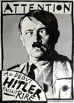 Affiche politique noir & blanc conçue par Alain Le Quernec en 1987 pour une commande locale du Parti socialiste (Finistère). Tirage offset sur papier, format env. 87,5 × 61 cm (ex. exemplaire conservé au Musée départemental breton). L’image détourne un portrait d’Hitler (cheveux ébouriffés, regard louché), encadrée de filets « de guingois » ; le slogan occupe un bandeau haut et un quartier de cercle en bas à gauche.
