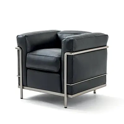 La LC2 est un fauteuil dessiné en 1928 par Le Corbusier, Pierre Jeanneret et Charlotte Perriand ; il est présenté au Salon d’Automne de Paris 1929 et réédité exclusivement par Cassina depuis 1965. Structure en acier tubulaire (chromé ou peint), coussins indépendants garnis mousse/duvet (selon versions), revêtus cuir ou tissu. Dim. MoMA d’un exemplaire historique : env. H 66 × L 76 × P 70,5 cm, assise 40,6 cm.