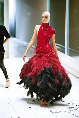 VOSS est la collection printemps-été 2001 d’Alexander McQueen. Le défilé — l’un de ses plus célèbres — place les modèles dans un cube vitré tapissé de miroirs, pour un huis clos inspiré de l’asile psychiatrique. McQueen y confronte beauté / monstruosité, nature / clinique, à travers des pièces-manifestes : robe en coquilles de couteaux (razor clams), bodice en lames de microscope sur jupe d’autruche, robe aux faucons naturalisés, etc.