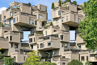 Habitat 67 est un ensemble résidentiel emblématique situé sur la presqu’île de la Cité-du-Havre, le long du fleuve Saint-Laurent à Montréal, Québec, Canada. Conçu par Moshe Safdie pour l’Exposition universelle de 1967 (Expo 67), il est achevé la même année. Le complexe comprend 146 à 158 logements assemblés à partir de modules préfabriqués en béton, répartis sur douze étages, avec chacune des unités bénéficiant au moins d’une terrasse privée.